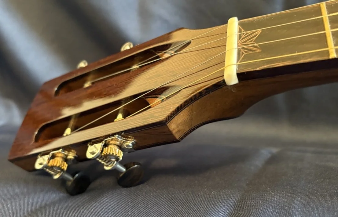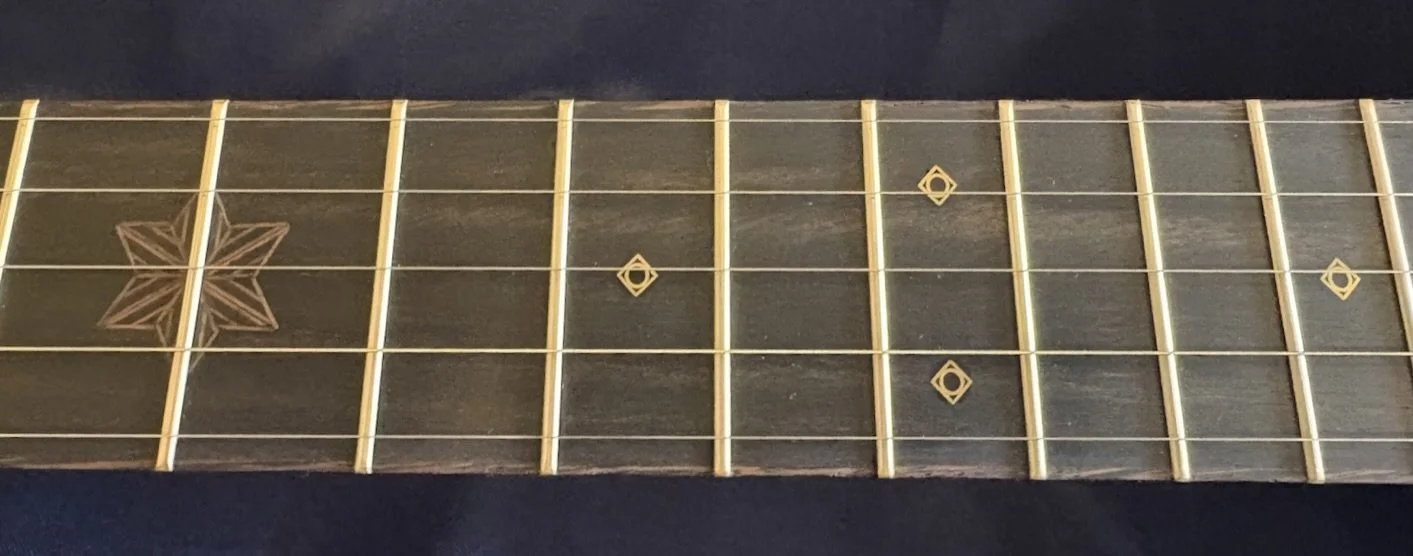 25.5” scale laminated walnut neck with decorative yosegi veneer