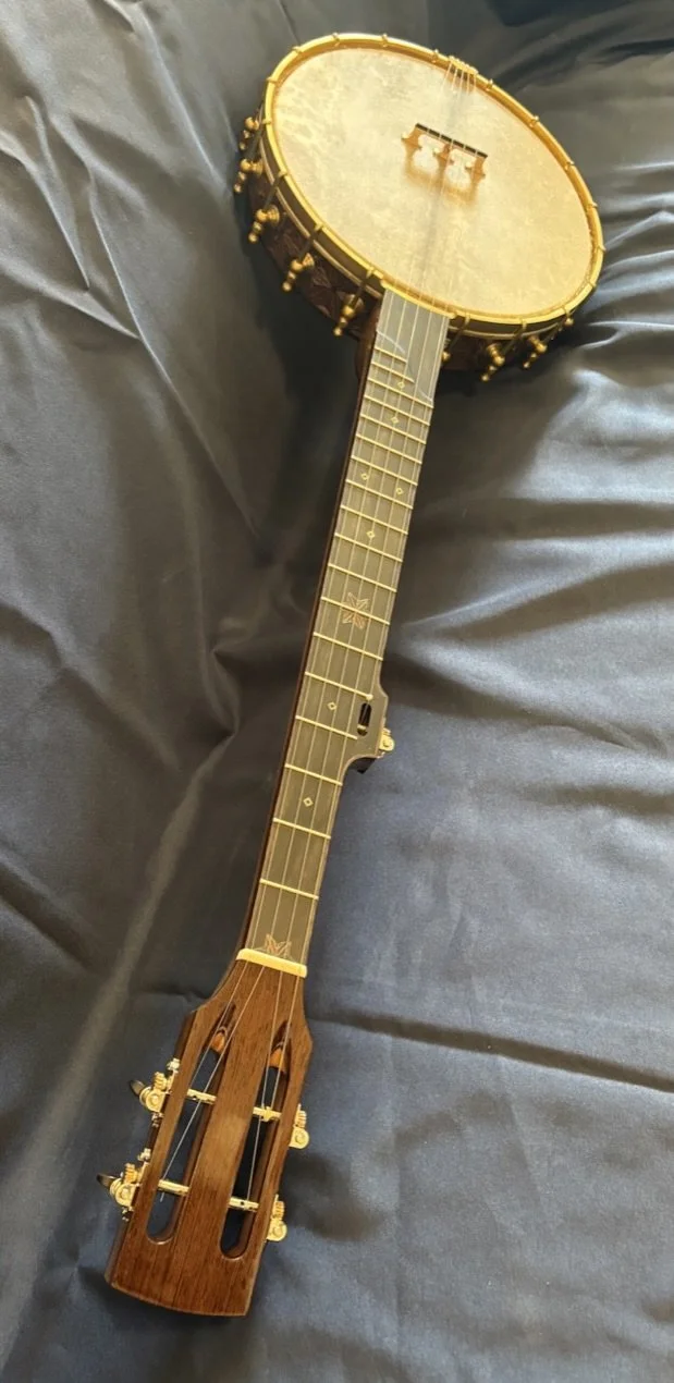 Ebony fingerboard with walnut binding, walnut fret markers, side dots, evo gold frets, Waverly tuners, and a frailing scoop