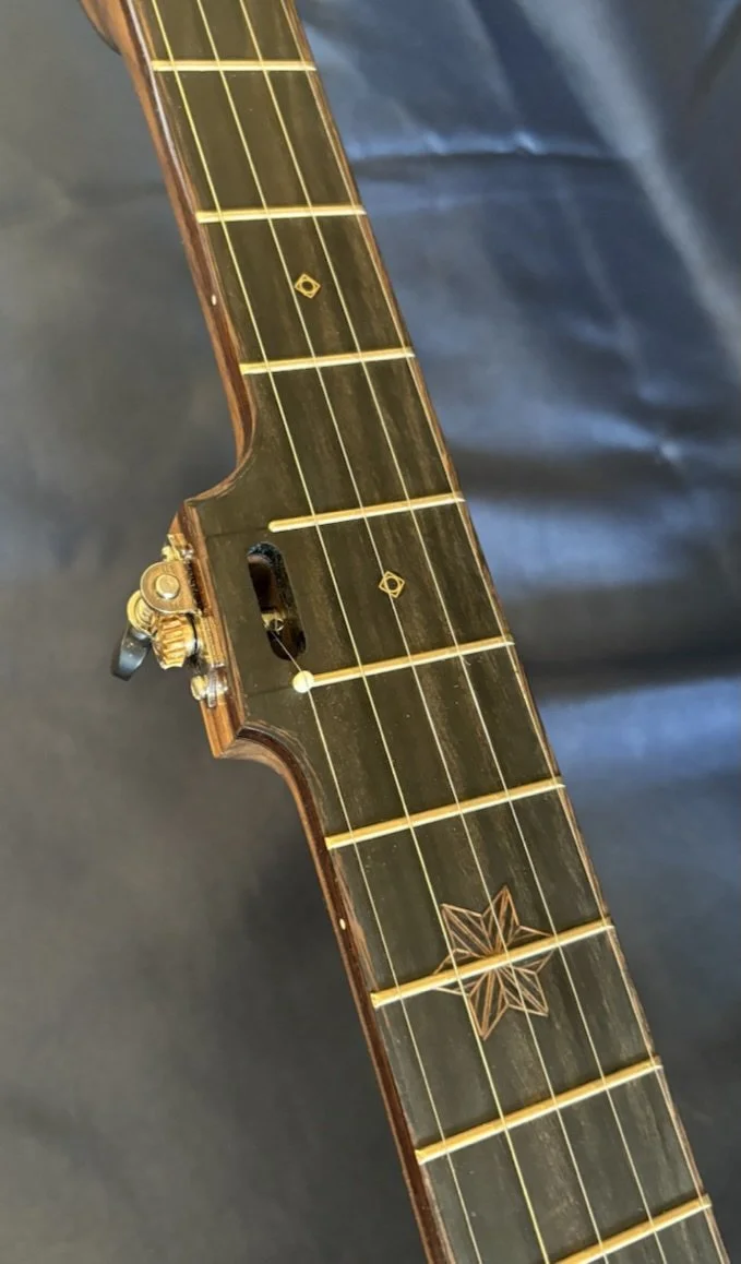 Ebony fingerboard with walnut binding, walnut fret markers, side dots, evo gold frets, Waverly tuners, and a frailing scoop